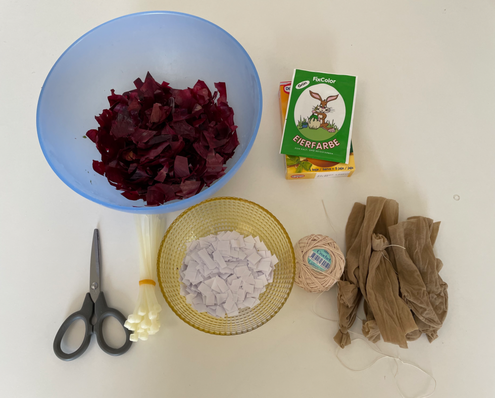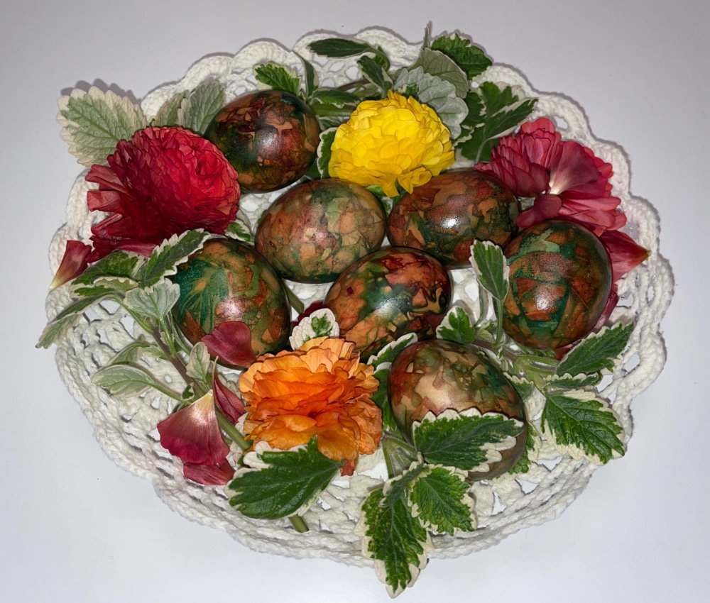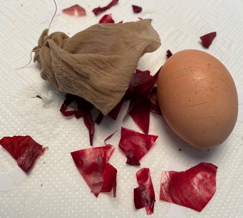 Uglavnom, umjetna boja je obojila dijelove jaja koje nisu bili prekriveni ljuskom luka ili izrezanim papirom.