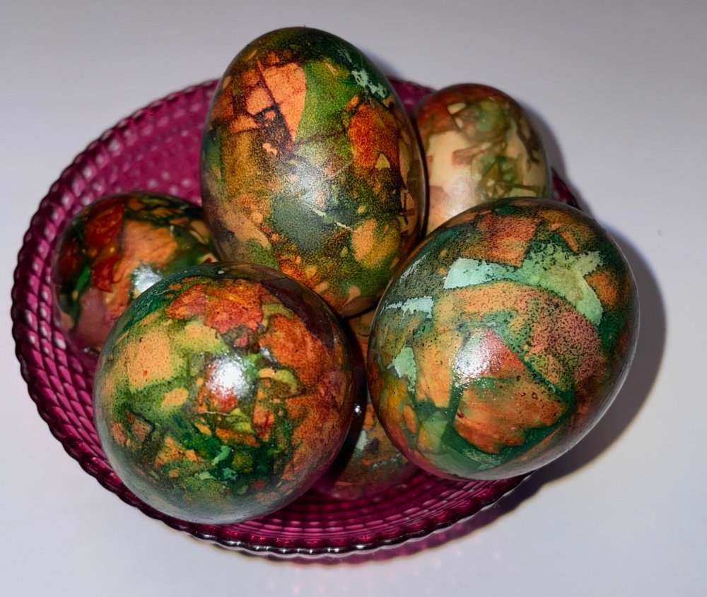 Istina, već smo pokušavali bojanje ljuskom luka, ali nikad nam to nije uspijevalo jer prenesena boja na ljusku jaja nije bila dovoljno intenzivna, pa je konačni efekt bio nekako prozirno dosadan.