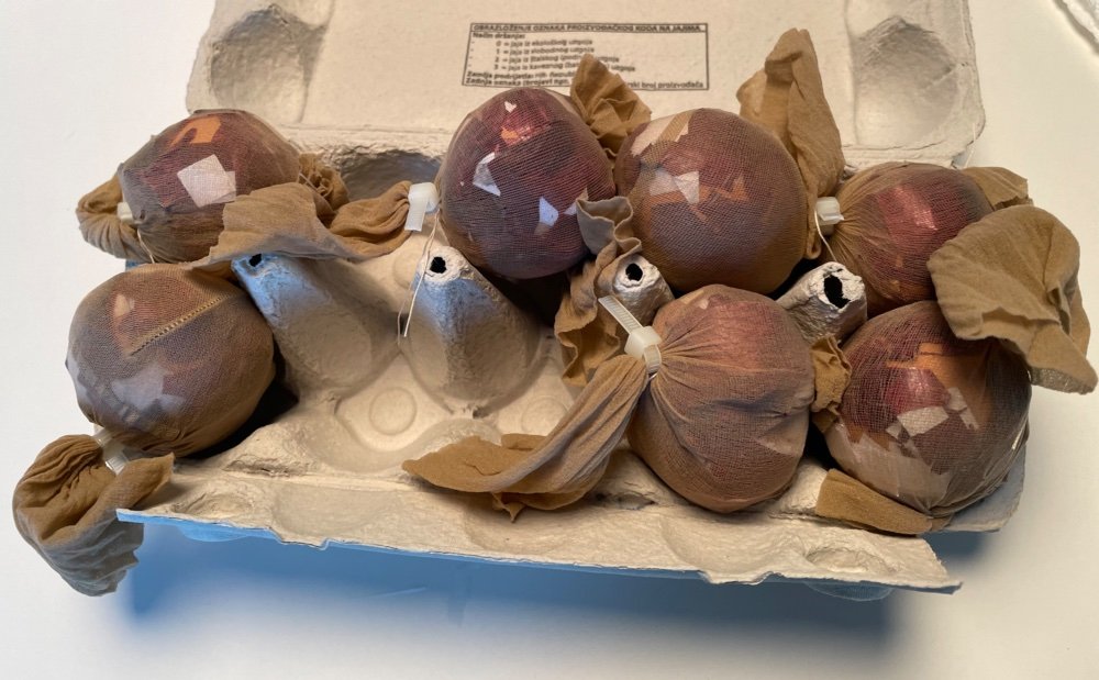 Onda sam ubacio jaje i izrezanu ljusku te papiriće i sve skupa učvrstio plastičnom vezicom jer je to najjednostavnije učiniti uz istovremeno natezanje rubova čarape.