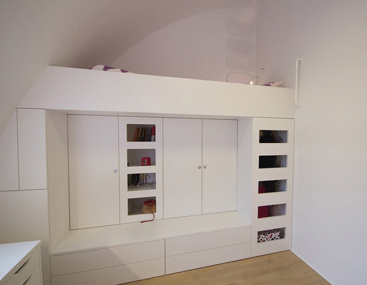 U vrijeme useljavanja, prije više od deset godina, ovu smo sobu pokušali namjestiti tako da koristi visinu – jer se radi o visokom potkrovlju. Krevet je podignut, a ispod njega su bili ormari i klupa za sjedenje, te radni stol pod prozorima. Ova rebrasta vrata su ujedno i ljestvice za pristup krevetu.